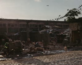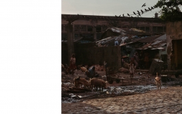 I was in the street of one of my pictures: a long row of three-story-high home-made wooden buildings where the trains pass overhead and there are kids everywhere.